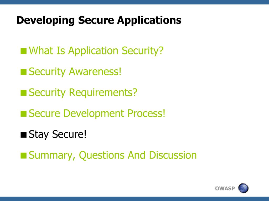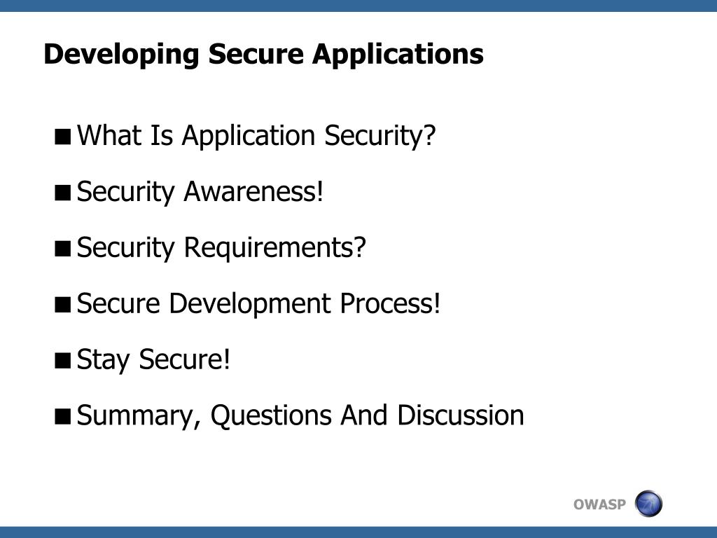 Developing Secure Applications • What Is Application Security? • Security Awareness! • Security Requirements? • Secure Development Process! • Stay Secure! • Summary, Questions And Discussion