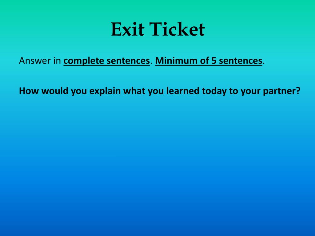 Exit Ticket Answer in complete sentences. Minimum of 5 sentences. How would you explain what you learned today to your partner?