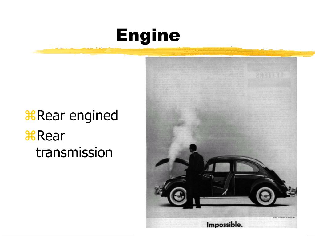 Beginnings - 1935 • People’s car : • Top speed of 100km/h • Fuel consumption of 7 litres per 100km • Be able to carry 2 adults and 3 children • Air-cooled • Should cost no more than RM (Reichsmarks) 1000 (£86)