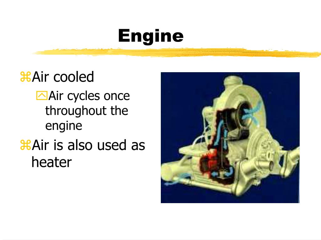 Engine • Air cooled • Air cycles once throughout the engine • Air is also used as heater