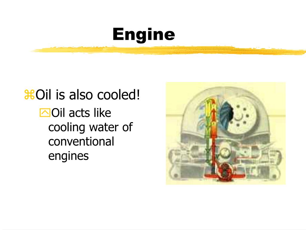 Engine • Oil is also cooled! • Oil acts like cooling water of conventional engines
