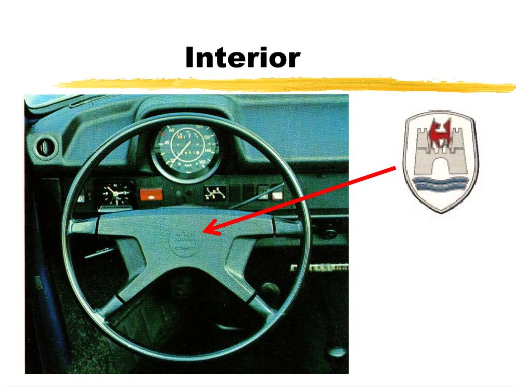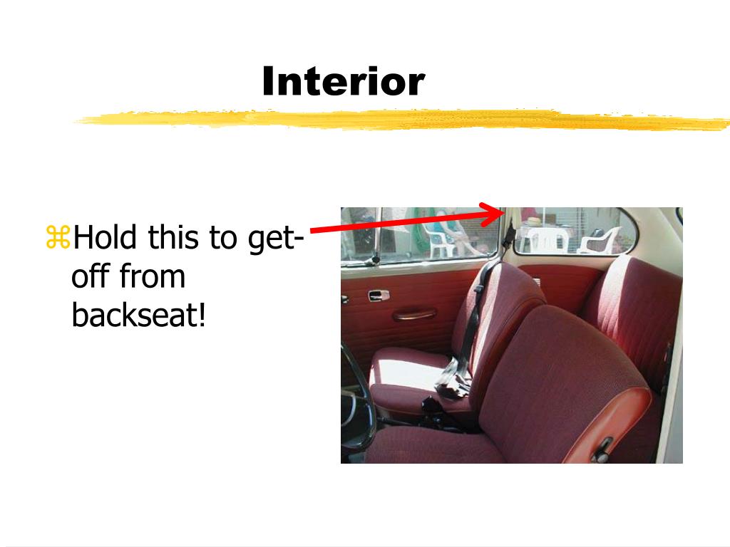 Interior • Metal dashboard • 1938->1972 • Many control button changes • Lift the lever up to seat on the back side