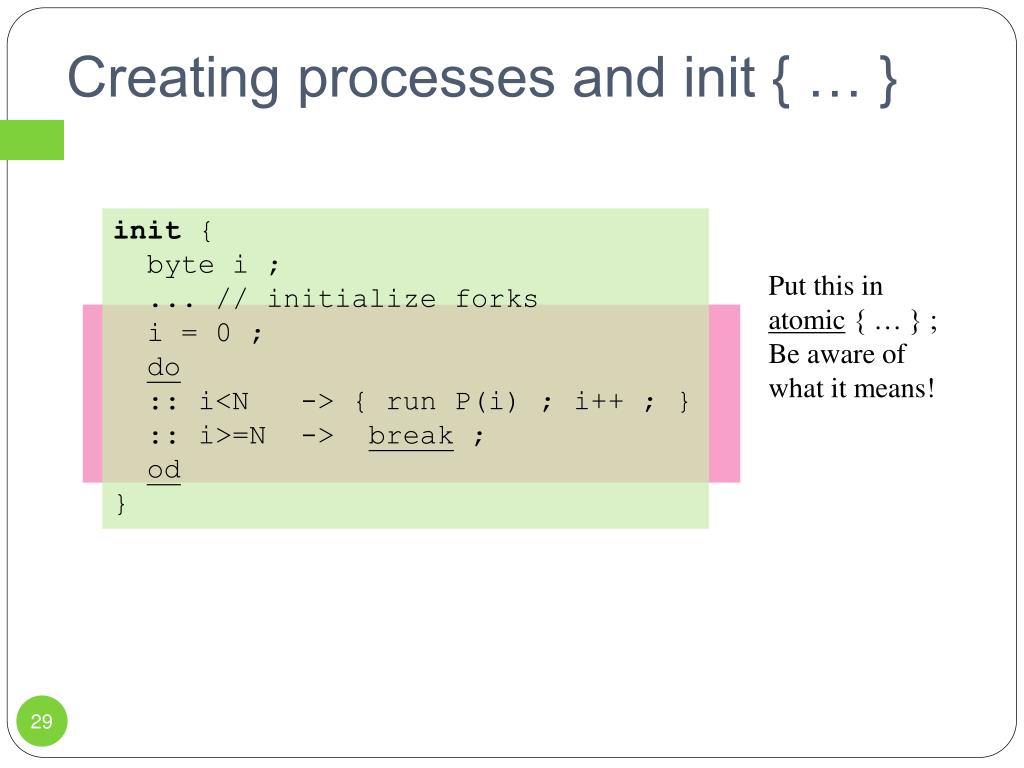 Creating processes and init { … } init { byte i ; ... // initialize forks i = 0 ; do :: i<N -> { run P(i) ; i++ ; } :: i>=N -> break ; od } Put this in atomic { … } ; Be aware of what it means!
