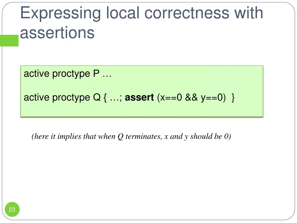 Expressing local correctness with assertions active proctype P …active proctype Q { …; assert (x==0 && y==0) } (here it implies that when Q terminates, x and y should be 0)