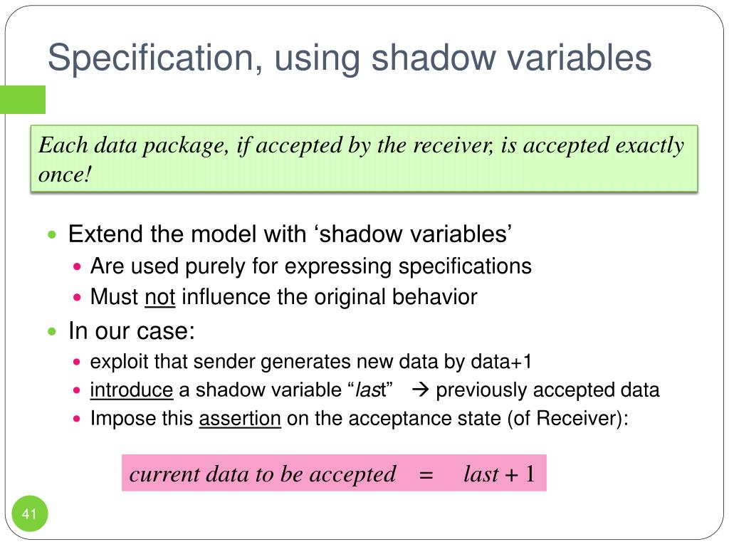 Specification, using shadow variables • Extend the model with ‘shadow variables’ • Are used purely for expressing specifications • Must not influence the original behavior • In our case: • exploit that sender generates new data by data+1 • introduce a shadow variable “last” previously accepted data • Impose this assertion on the acceptance state (of Receiver): Each data package, if accepted by the receiver, is accepted exactly once! current data to be accepted = last + 1