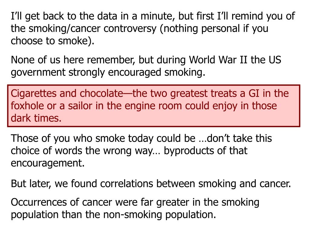 I’ll get back to the data in a minute, but first I’ll remind you of the smoking/cancer controversy (nothing personal if you choose to smoke). None of us here remember, but during World War II the US government strongly encouraged smoking. Cigarettes and chocolate—the two greatest treats a GI in the foxhole or a sailor in the engine room could enjoy in those dark times. Those of you who smoke today could be …don’t take this choice of words the wrong way… byproducts of that encouragement. But later, we found correlations between smoking and cancer. Occurrences of cancer were far greater in the smoking population than the non-smoking population.