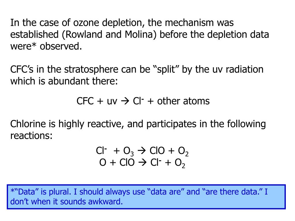 In the case of ozone depletion, the mechanism was established (Rowland and Molina) before the depletion data were* observed. CFC’s in the stratosphere can be “split” by the uv radiation which is abundant there: CFC + uv Cl- + other atoms Chlorine is highly reactive, and participates in the following reactions: Cl- + O3 ClO + O2 O + ClO Cl- + O2 *“Data” is plural. I should always use “data are” and “are there data.” I don’t when it sounds awkward.