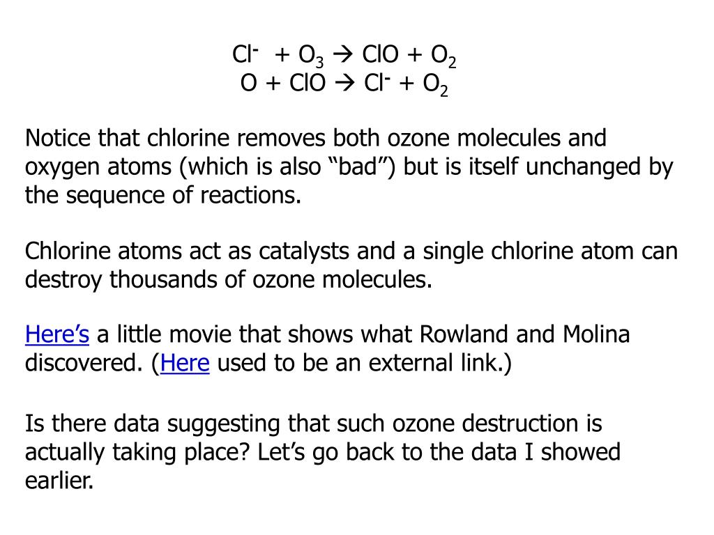 Cl- + O3 ClO + O2 O + ClO Cl- + O2 Notice that chlorine removes both ozone molecules and oxygen atoms (which is also “bad”) but is itself unchanged by the sequence of reactions. Chlorine atoms act as catalysts and a single chlorine atom can destroy thousands of ozone molecules. Here’s a little movie that shows what Rowland and Molina discovered. (Here used to be an external link.) Is there data suggesting that such ozone destruction is actually taking place? Let’s go back to the data I showed earlier.