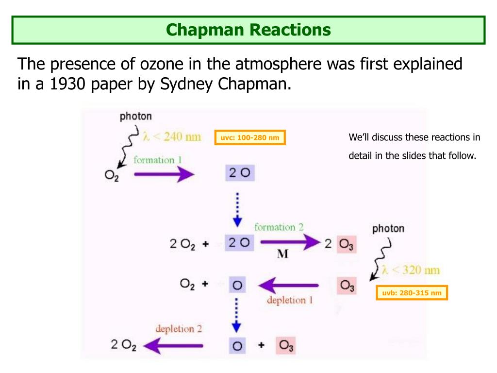 Chapman Reactions The presence of ozone in the atmosphere was first explained in a 1930 paper by Sydney Chapman. We’ll discuss these reactions in detail in the slides that follow. uvc: 100-280 nm uvb: 280-315 nm