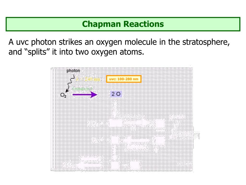 Chapman Reactions A uvc photon strikes an oxygen molecule in the stratosphere, and “splits” it into two oxygen atoms. uvc: 100-280 nm