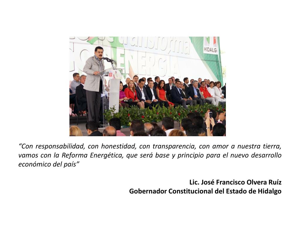 “Con responsabilidad, con honestidad, con transparencia, con amor a nuestra tierra, vamos con la Reforma Energética, que será base y principio para el nuevo desarrollo económico del país” Lic. José Francisco Olvera Ruíz Gobernador Constitucional del Estado de Hidalgo