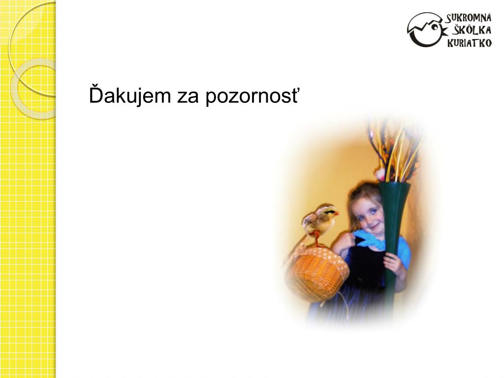 Ponúkané služby Rozvíjanie kreativity každého dieťaťa Pocit bezpečia a pohodlia aj počas neprítomnosti rodiča Odvoz detí do škôlky, zo škôlky Vyhovenie požiadaviek každého rodiča Možnosť prihlásiť dieťa na akýkoľvek krúžok Baby sitting Narodeninové oslavy Spolupráca s logopédom a detským psychológom Bezpečnosť Výučba básničiek, pesničiek, besiedky Možnosť pripoistenia dieťaťa Udržiavanie zdravia dieťaťa Recyklovanie odpadu „Skryjem ťa pod moje krídla“