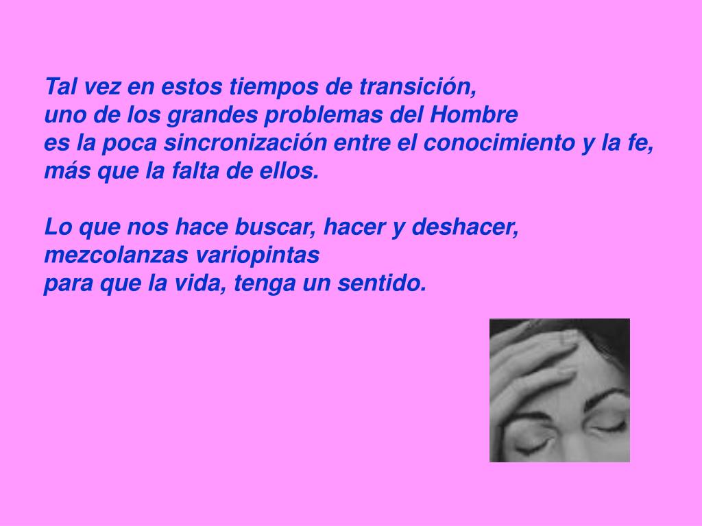 Tal vez en estos tiempos de transición,uno de los grandes problemas del Hombrees la poca sincronización entre el conocimiento y la fe,más que la falta de ellos.Lo que nos hace buscar, hacer y deshacer,mezcolanzas variopintaspara que la vida, tenga un sentido.