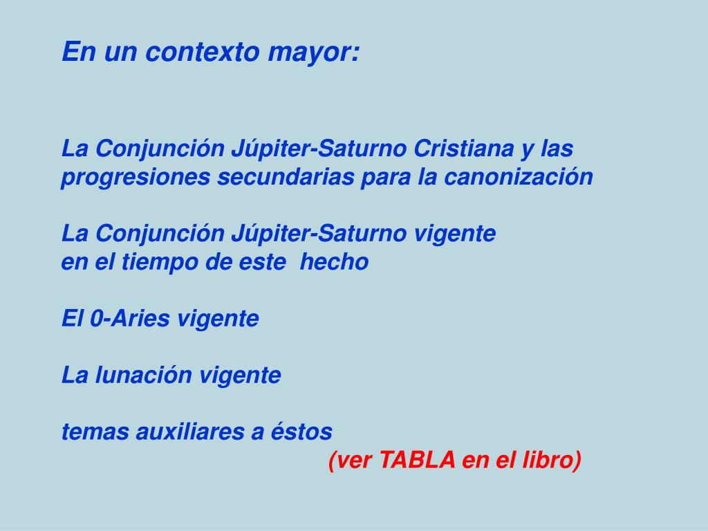 En un contexto mayor:La Conjunción Júpiter-Saturno Cristiana y las progresiones secundarias para la canonizaciónLa Conjunción Júpiter-Saturno vigenteen el tiempo de este hechoEl 0-Aries vigenteLa lunación vigentetemas auxiliares a éstos(ver TABLA en el libro)