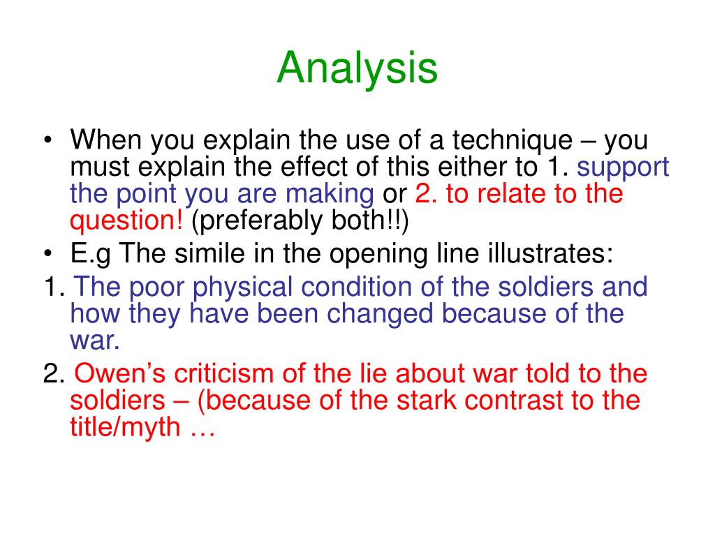 Analysis • When you explain the use of a technique – you must explain the effect of this either to 1. support the point you are making or 2. to relate to the question! (preferably both!!) • E.g The simile in the opening line illustrates: 1. The poor physical condition of the soldiers and how they have been changed because of the war. 2. Owen’s criticism of the lie about war told to the soldiers – (because of the stark contrast to the title/myth …