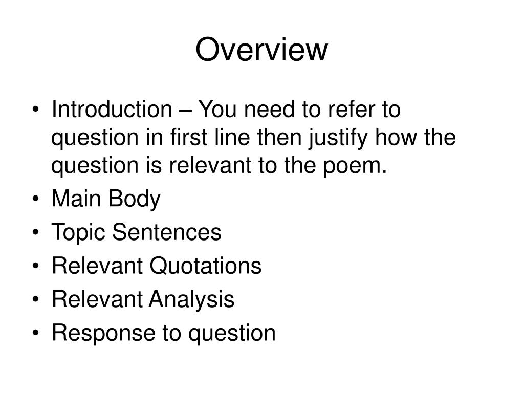 Overview • Introduction – You need to refer to question in first line then justify how the question is relevant to the poem. • Main Body • Topic Sentences • Relevant Quotations • Relevant Analysis • Response to question