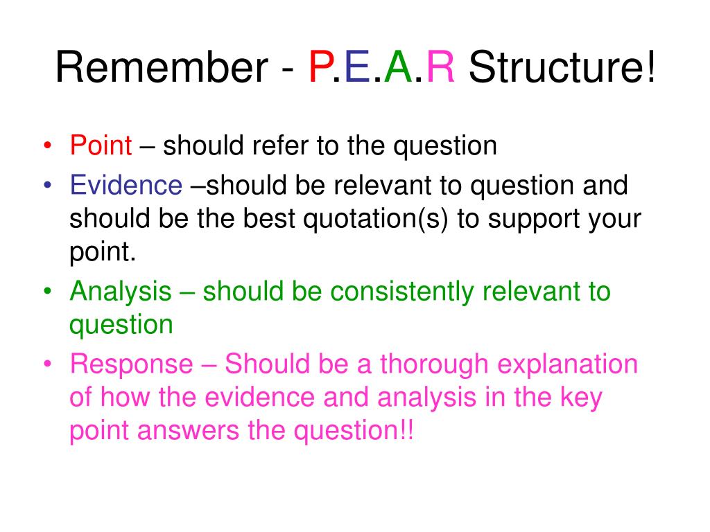 Remember - P.E.A.R Structure! • Point – should refer to the question • Evidence –should be relevant to question and should be the best quotation(s) to support your point. • Analysis –should be consistently relevant to question • Response – Should be a thorough explanation of how the evidence and analysis in the key point answers the question!!