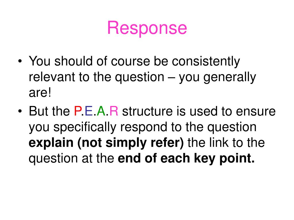 Response • You should of course be consistently relevant to the question – you generally are! • But the P.E.A.R structure is used to ensure you specifically respond to the question explain (not simply refer) the link to the question at the end of each key point.