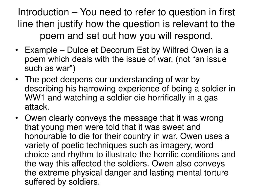 Dulce et Decorum Est. How to respond to the question. Overview. Introduction – You need to refer to question in first line then justify how the question is relevant to the poem. Main Body Topic Sentences Relevant Quotations Relevant Analysis Response to question.