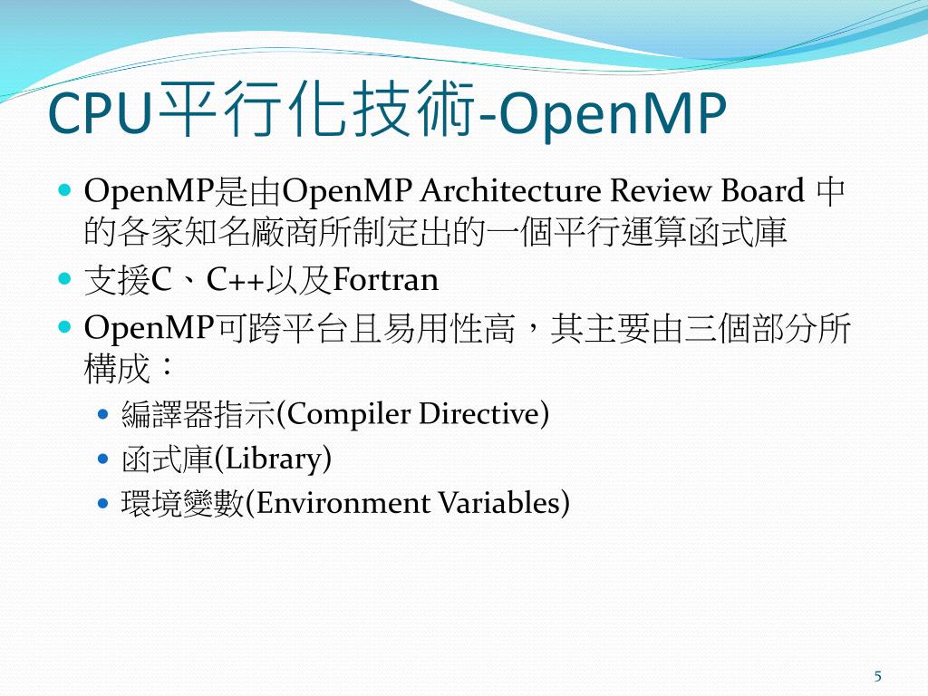 CPU平行化技術-OpenMP • OpenMP是由OpenMP Architecture Review Board 中的各家知名廠商所制定出的一個平行運算函式庫 • 支援C、C++以及Fortran • OpenMP可跨平台且易用性高,其主要由三個部分所構成: • 編譯器指示(Compiler Directive) • 函式庫(Library) • 環境變數(Environment Variables)