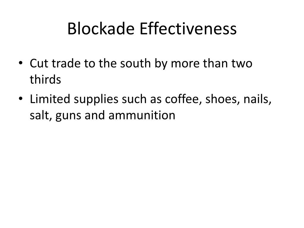 Blockade Effectiveness • Cut trade to the south by more than two thirds • Limited supplies such as coffee, shoes, nails, salt, guns and ammunition