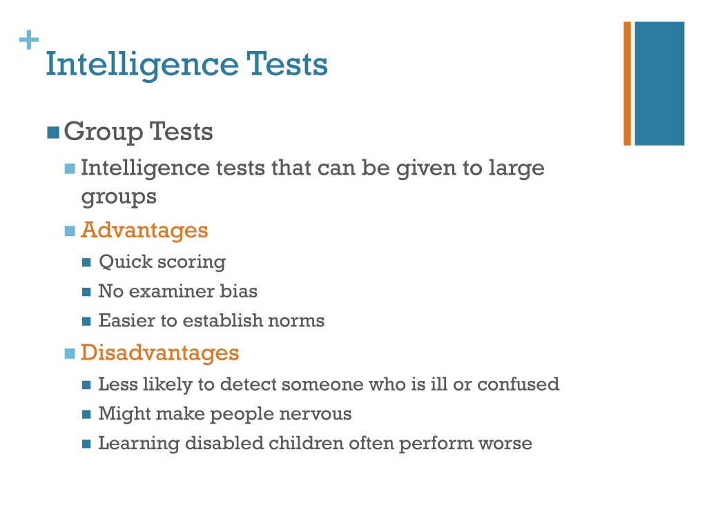 Intelligence Tests • Group Tests • Intelligence tests that can be given to large groups • Advantages • Quick scoring • No examiner bias • Easier to establish norms • Disadvantages • Less likely to detect someone who is ill or confused • Might make people nervous • Learning disabled children often perform worse