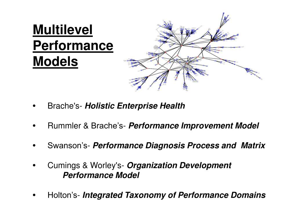Multilevel Performance Models • Brache's-Holistic Enterprise Health • Rummler & Brache’s- Performance Improvement Model • Swanson’s-Performance Diagnosis Process and Matrix • Cumings & Worley's- Organization Development Performance Model • Holton’s-Integrated Taxonomy of Performance Domains