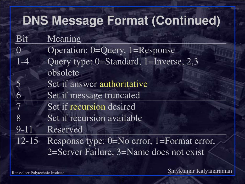 DNS Message Format (Continued) Bit Meaning 0 Operation: 0=Query, 1=Response 1-4 Query type: 0=Standard, 1=Inverse, 2,3 obsolete 5 Set if answer authoritative 6 Set if message truncated 7 Set if recursion desired 8 Set if recursion available 9-11 Reserved 12-15 Response type: 0=No error, 1=Format error, 2=Server Failure, 3=Name does not exist