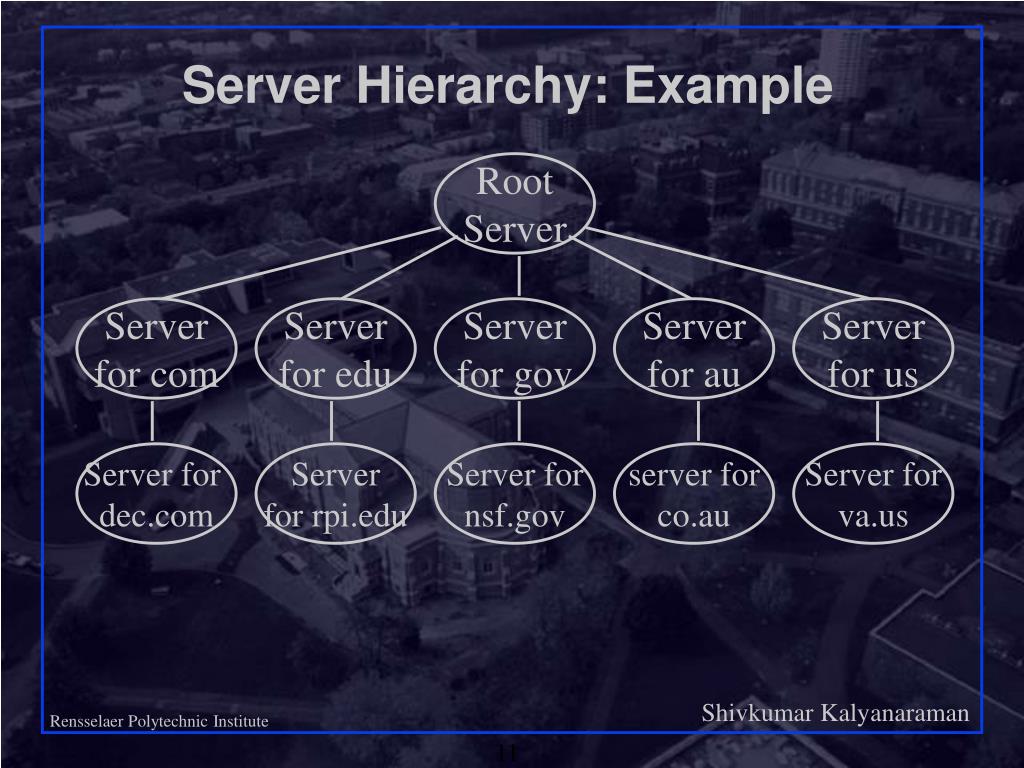 Server Hierarchy: Example RootServer Serverfor com Serverfor edu Serverfor gov Serverfor au Serverfor us Server for dec.com Serverfor rpi.edu Server fornsf.gov server forco.au Server forva.us