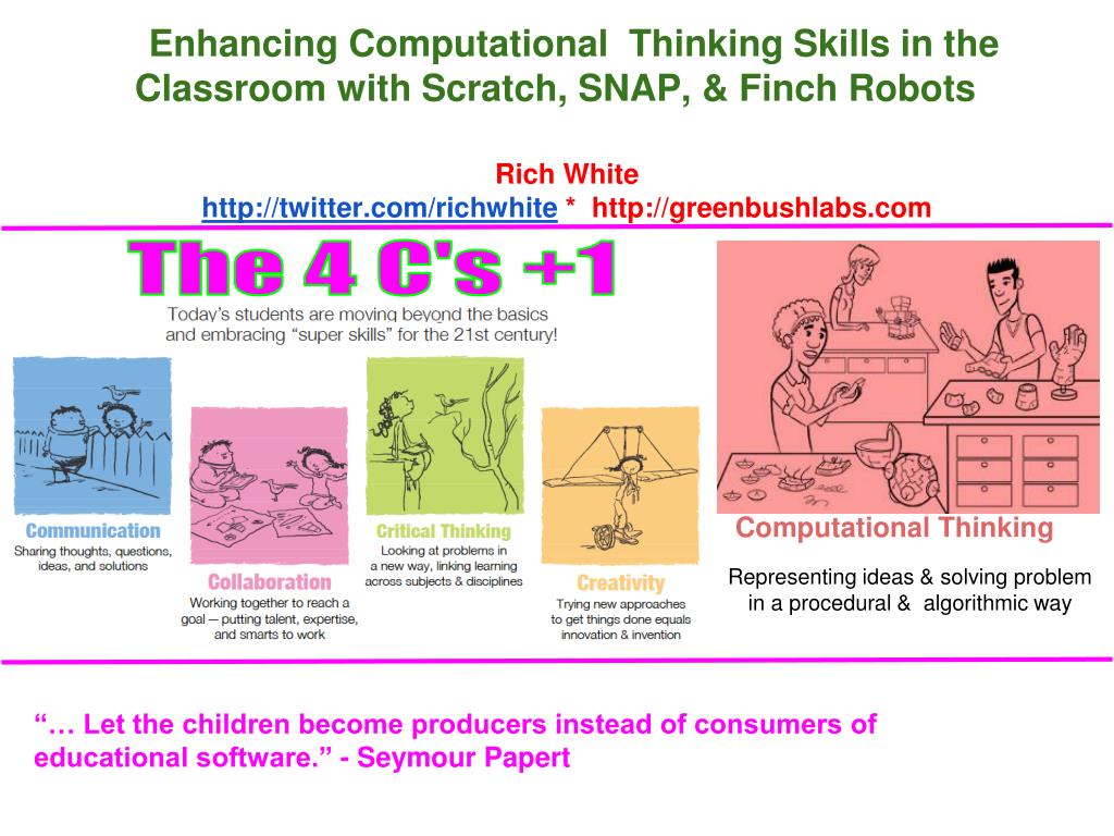 Enhancing Computational Thinking Skills in the Classroom with Scratch, SNAP, & Finch Robots. Rich White http://twitter.com/richwhite * http://greenbushlabs.com. Computational Thinking. Representing ideas & solving problem in a procedural & algorithmic way .