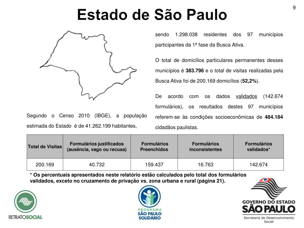 Estado de São Paulo 9 Segundo o Censo 2010 (IBGE), a população estimada do Estado é de 41.262.199 habitantes, sendo 1.298.038 residentes dos 97 municípios participantes da 1ª fase da Busca Ativa. O total de domicílios particulares permanentes desses municípios é 383.796 e o total de visitas realizadas pela Busca Ativa foi de 200.169 domicílios (52,2%). De acordo com os dados validados (142.674 formulários), os resultados destes 97 municípios referem-se às condições socioeconômicas de 484.184 cidadãos paulistas. * Os percentuais apresentados neste relatório estão calculados pelo total dos formulários validados, exceto no cruzamento de privação vs. zona urbana e rural (página 21).