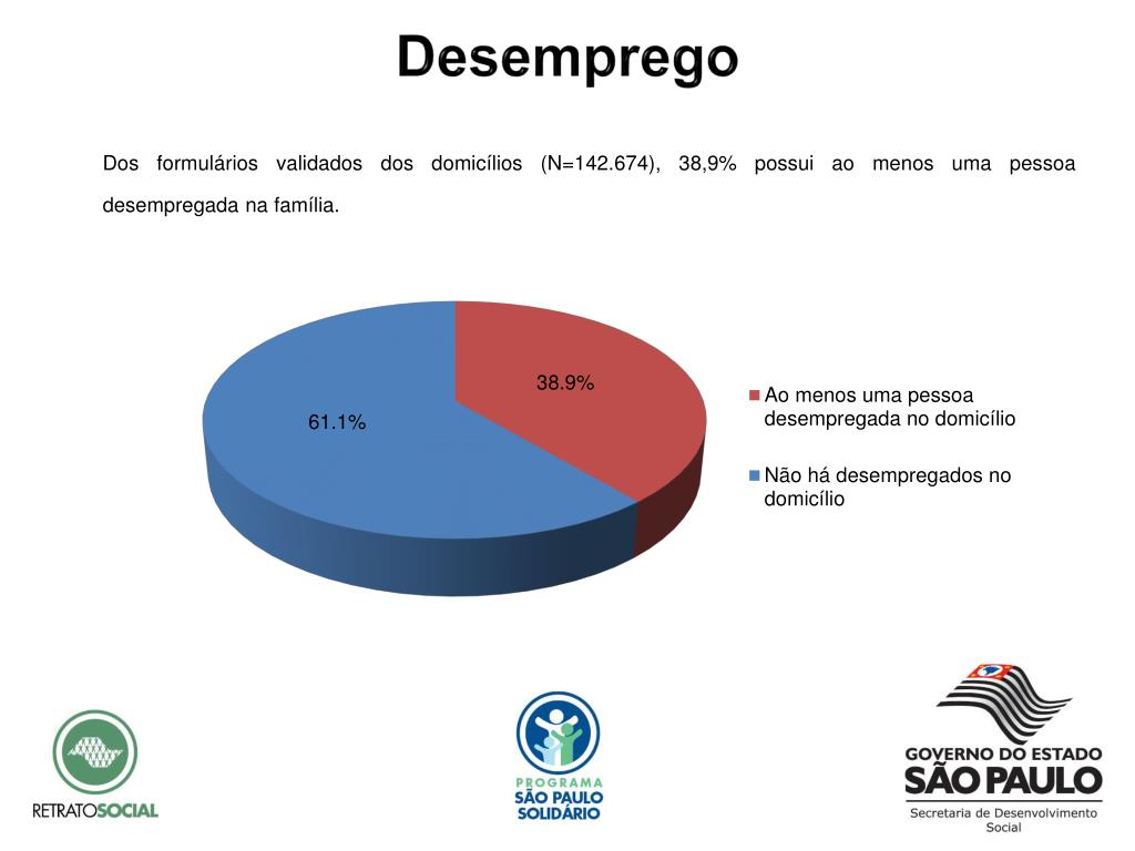 Desemprego Dos formulários validados dos domicílios (N=142.674), 38,9% possui ao menos uma pessoa desempregada na família.