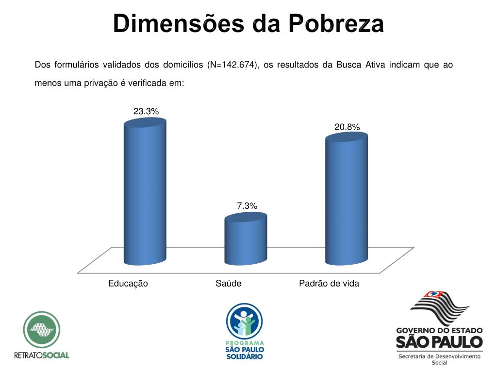 Dimensões da Pobreza Dos formulários validados dos domicílios (N=142.674), os resultados da Busca Ativa indicam que ao menos uma privação é verificada em: