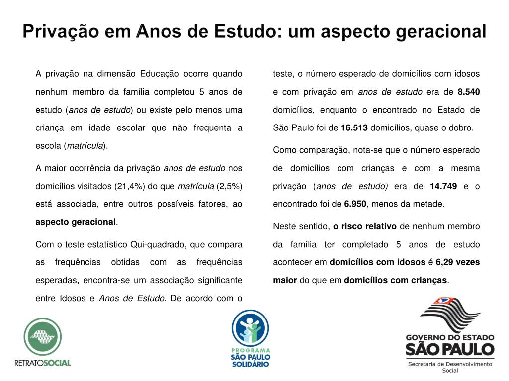 Privação em Anos de Estudo: um aspecto geracional A privação na dimensão Educação ocorre quando nenhum membro da família completou 5 anos de estudo (anos de estudo) ou existe pelo menos uma criança em idade escolar que não frequenta a escola (matrícula). A maior ocorrência da privação anos de estudo nos domicílios visitados (21,4%) do que matrícula (2,5%) está associada, entre outros possíveis fatores, ao aspecto geracional. Com o teste estatístico Qui-quadrado, que compara as frequências obtidas com as frequências esperadas, encontra-se um associação significante entre Idosos e Anos de Estudo. De acordo com o teste, o número esperado de domicílios com idosos e com privação em anos de estudo era de 8.540 domicílios, enquanto o encontrado no Estado de São Paulo foi de 16.513 domicílios, quase o dobro. Como comparação, nota-se que o número esperado de domicílios com crianças e com a mesma privação (anos de estudo) era de 14.749 e o encontrado foi de 6.950, menos da metade. Neste sentido, o risco relativo de nenhum membro da família ter completado 5 anos de estudoacontecer em domicílios com idosos é 6,29 vezes maior do que em domicílios com crianças.