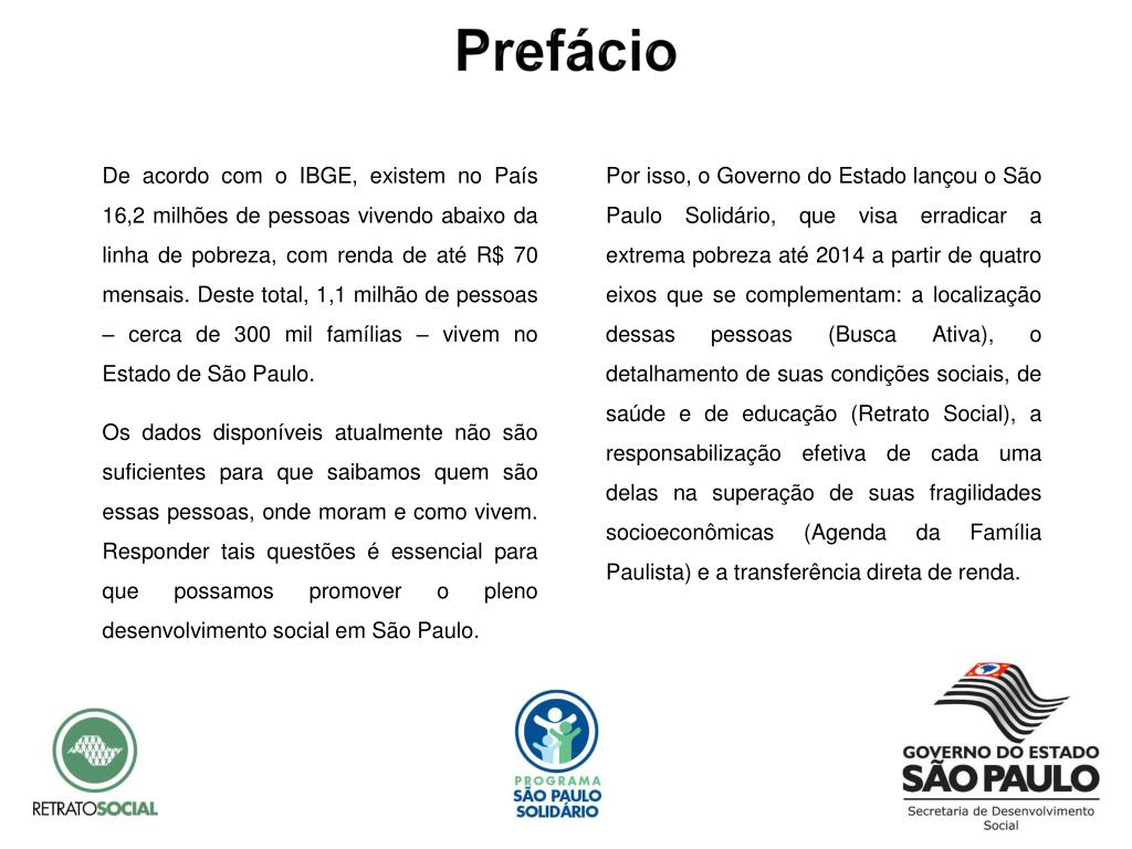 Prefácio De acordo com o IBGE, existem no País 16,2 milhões de pessoas vivendo abaixo da linha de pobreza, com renda de até R$ 70 mensais. Deste total, 1,1 milhão de pessoas – cerca de 300 mil famílias – vivem no Estado de São Paulo. Os dados disponíveis atualmente não são suficientes para que saibamos quem são essas pessoas, onde moram e como vivem. Responder tais questões é essencial para que possamos promover o pleno desenvolvimento social em São Paulo. Por isso, o Governo do Estado lançou o São Paulo Solidário, que visa erradicar a extrema pobreza até 2014 a partir de quatro eixos que se complementam: a localização dessas pessoas (Busca Ativa), o detalhamento de suas condições sociais, de saúde e de educação (Retrato Social), a responsabilização efetiva de cada uma delas na superação de suas fragilidades socioeconômicas (Agenda da Família Paulista) e a transferência direta de renda.