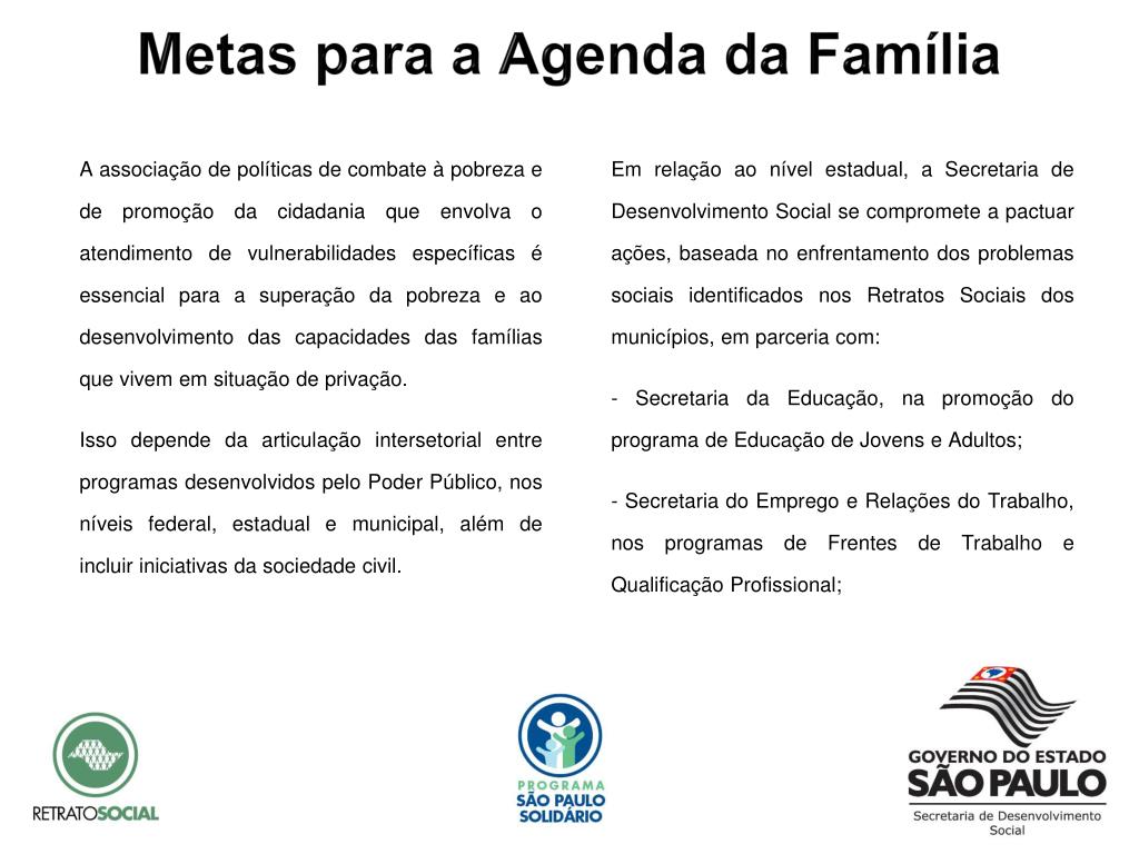 Metas para a Agenda da Família A associação de políticas de combate à pobreza e de promoção da cidadania que envolva o atendimento de vulnerabilidades específicas é essencial para a superação da pobreza e ao desenvolvimento das capacidades das famílias que vivem em situação de privação. Isso depende da articulação intersetorial entre programas desenvolvidos pelo Poder Público, nos níveis federal, estadual e municipal, além de incluir iniciativas da sociedade civil. Em relação ao nível estadual, a Secretaria de Desenvolvimento Social se compromete a pactuar ações, baseada no enfrentamento dos problemas sociais identificados nos Retratos Sociais dos municípios, em parceria com: - Secretaria da Educação, na promoção do programa de Educação de Jovens e Adultos; - Secretaria do Emprego e Relações do Trabalho, nos programas de Frentes de Trabalho e Qualificação Profissional;