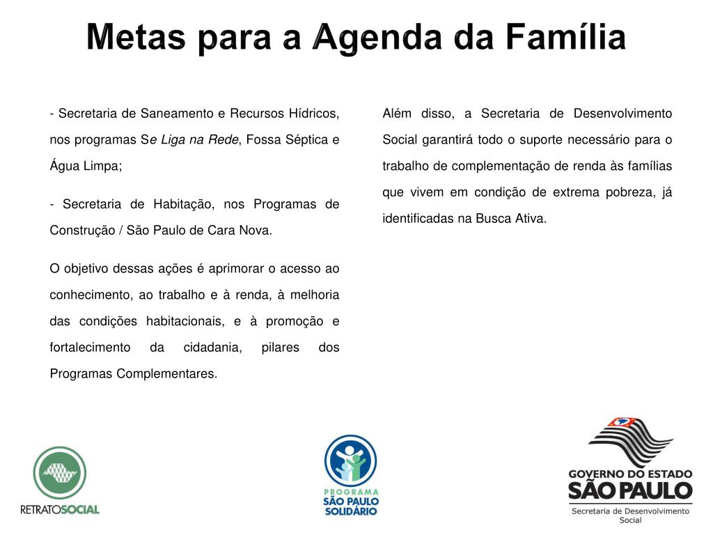 Metas para a Agenda da Família • - Secretaria de Saneamento e Recursos Hídricos, nos programas Se Liga na Rede, Fossa Séptica e Água Limpa; • - Secretaria de Habitação, nos Programas de Construção / São Paulo de Cara Nova. • O objetivo dessas ações é aprimorar o acesso ao conhecimento, ao trabalho e à renda, à melhoria das condições habitacionais, e à promoção e fortalecimento da cidadania, pilares dos Programas Complementares. • Além disso, a Secretaria de Desenvolvimento Social garantirá todo o suporte necessário para o trabalho de complementação de renda às famílias que vivem em condição de extrema pobreza, já identificadas na Busca Ativa.