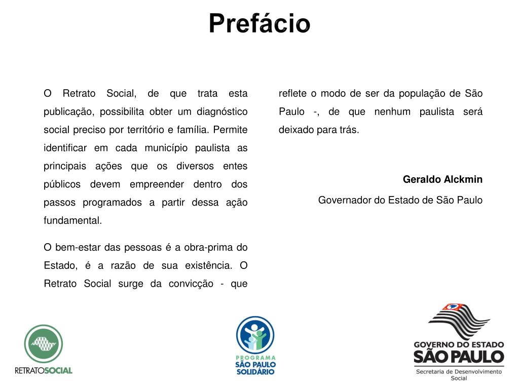 Prefácio O Retrato Social, de que trata esta publicação, possibilita obter um diagnóstico social preciso por território e família. Permite identificar em cada município paulista as principais ações que os diversos entes públicos devem empreender dentro dos passos programados a partir dessa ação fundamental. O bem-estar das pessoas é a obra-prima do Estado, é a razão de sua existência. O Retrato Social surge da convicção - que reflete o modo de ser da população de São Paulo -, de que nenhum paulista será deixado para trás. Geraldo Alckmin Governador do Estado de São Paulo