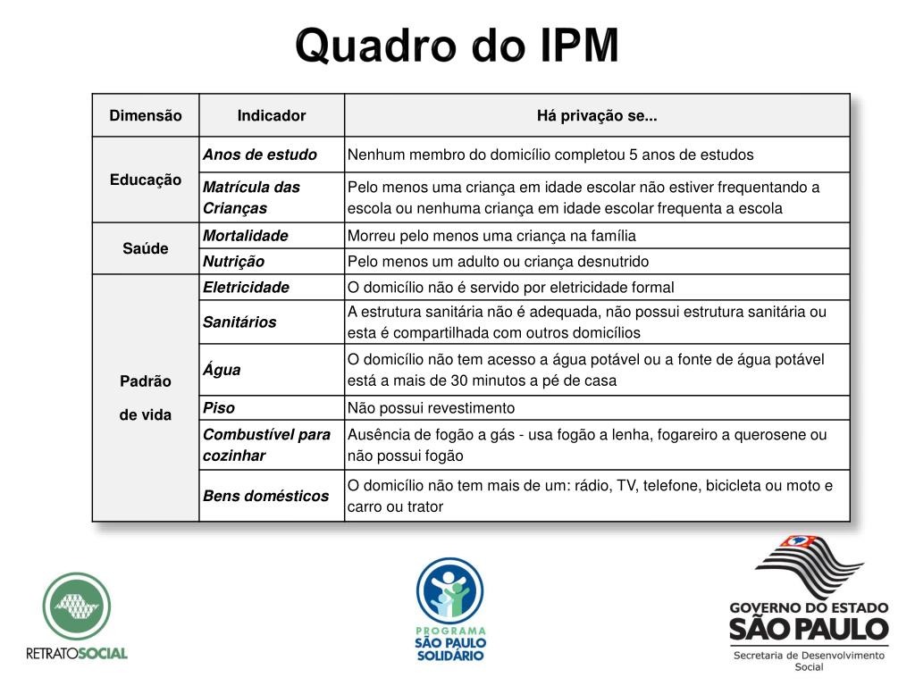 Valor do IPM • O IPM identifica diversas privações relacionadas às dimensões da Educação, Saúde e Padrão de Vida. Cada dimensão possui um peso igual e tem a pontuação máxima equivalente a 1/3 do total. Contam com 2 indicadores em Educação, 2 indicadores em Saúde e 6 indicadores em Padrão de Vida e recebem um valor correspondente a essa divisão. • O valor do IPM é o resultado de duas medidas: a proporção entre o número de pessoas pertencentes às famílias multidimensionalmentepobres (com 33,3% ou mais de privação) e a população total visitada com a intensidade (ou amplitude) da pobreza, medida por esses indicadores. • Essa medida varia de 0 a 1. O valor do IPM do Brasil é de 0,039. • Esse cálculo pode sofrer variação, de acordo com a quantidade de famílias que apresentam o grau de privação considerado para ele e o número de residentes das famílias visitadas. • Considerando-se essas referências, o número de domicílios visitados e o de questionários validados, no Estado de São Paulo, o IPM calculado é de0,010.