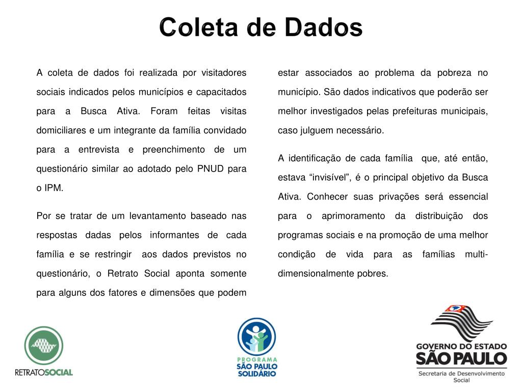 Coleta de Dados A coleta de dados foi realizada por visitadores sociais indicados pelos municípios e capacitados para a Busca Ativa. Foram feitas visitas domiciliares e um integrante da família convidado para a entrevista e preenchimento de um questionário similar ao adotado pelo PNUD para o IPM. Por se tratar de um levantamento baseado nas respostas dadas pelos informantes de cada família e se restringir aos dados previstos no questionário, o Retrato Social aponta somente para alguns dos fatores e dimensões que podem estar associados ao problema da pobreza no município. São dados indicativos que poderão ser melhor investigados pelas prefeituras municipais, caso julguem necessário. A identificação de cada família que, até então, estava “invisível”, é o principal objetivo da Busca Ativa. Conhecer suas privações será essencial para o aprimoramento da distribuição dos programas sociais e na promoção de uma melhor condição de vida para as famílias multi-dimensionalmente pobres.