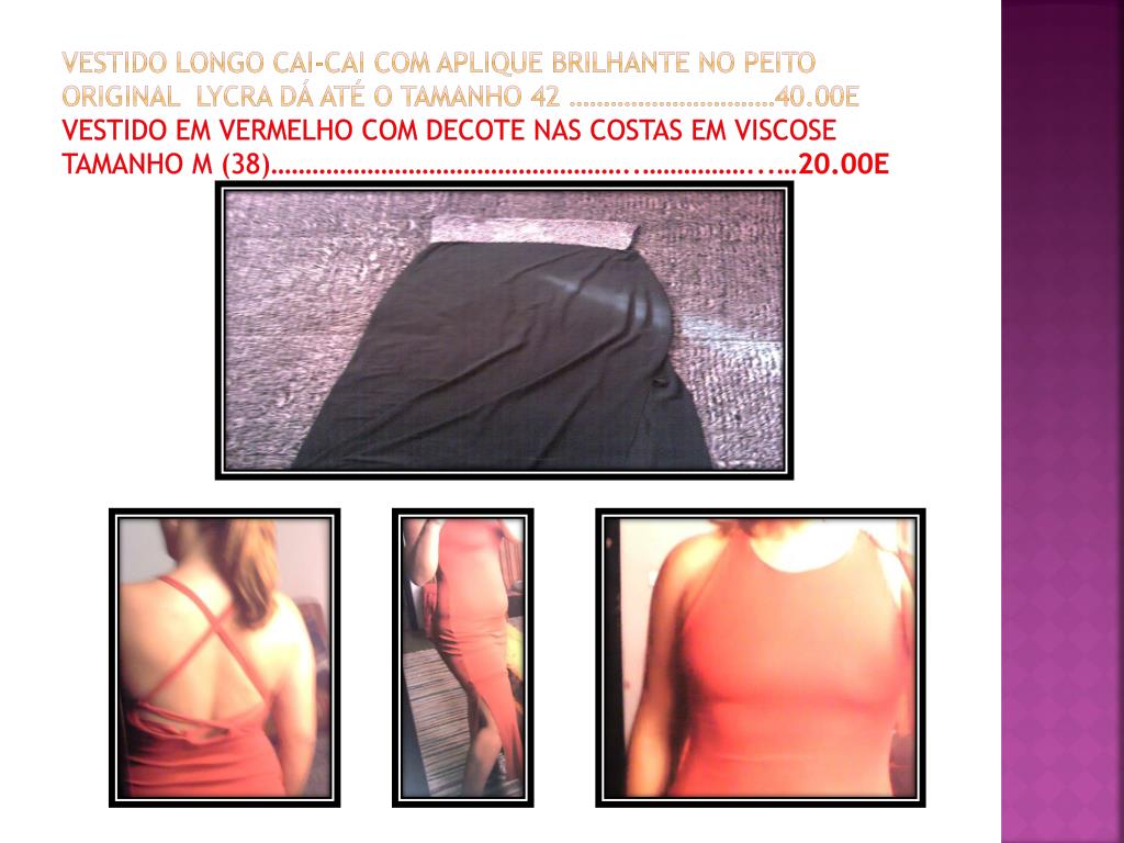 Vestido longo cai-cai com aplique brilhante no peito original lycra dá até o tamanho 42 …………………………40.00Evestido em vermelho com decote nas costas em viscose tamanho m (38)……………………………………………..……………...…20.00E