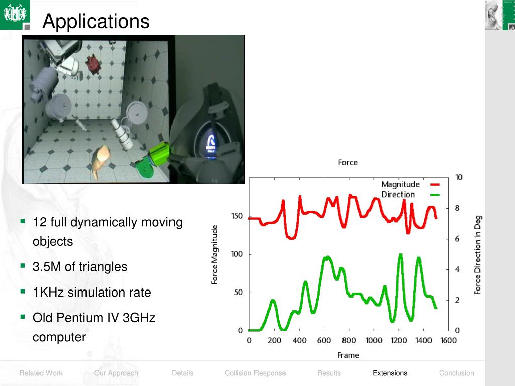 Applications • 12 full dynamically moving objects • 3.5M of triangles • 1KHz simulation rate • Old Pentium IV 3GHz computer Related Work Our Approach Details Collision Response Results Extensions Conclusion