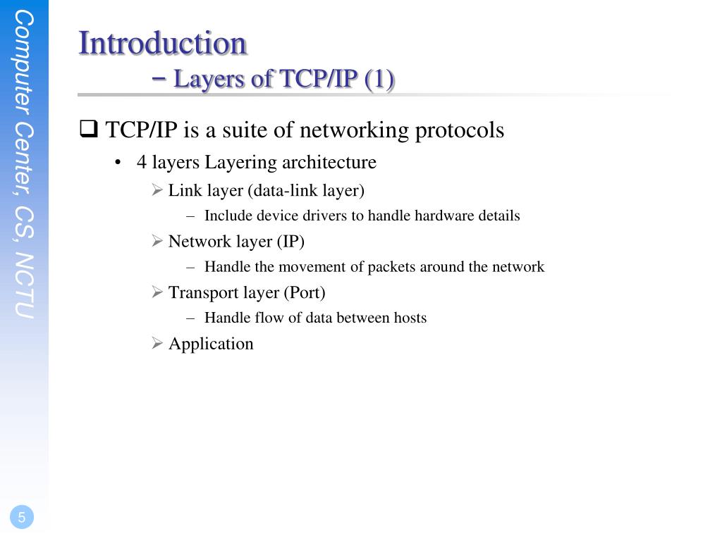 Introduction– Layers of TCP/IP (1) • TCP/IP is a suite of networking protocols • 4 layers Layering architecture • Link layer (data-link layer) • Include device drivers to handle hardware details • Network layer (IP) • Handle the movement of packets around the network • Transport layer (Port) • Handle flow of data between hosts • Application