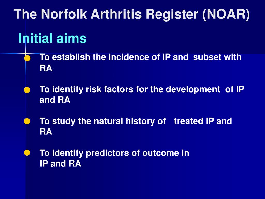 The Norfolk Arthritis Register (NOAR) Initial aims To establish the incidence of IP and subset with RA To identify risk factors for the development of IP and RA To study the natural history of treated IP and RA To identify predictors of outcome in IP and RA