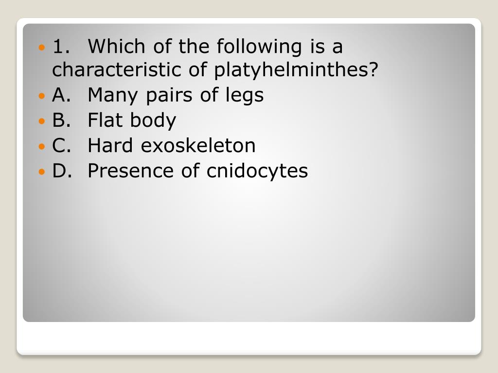 1. Which of the following is a characteristic of platyhelminthes? • A. Many pairs of legs • B. Flat body • C. Hard exoskeleton • D. Presence of cnidocytes