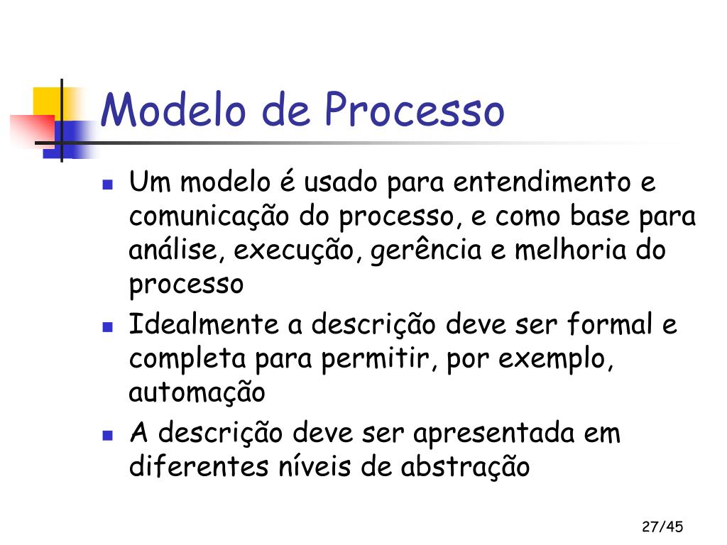 Modelo de Processo • Um modelo é usado para entendimento e comunicação do processo, e como base para análise, execução, gerência e melhoria do processo • Idealmente a descrição deve ser formal e completa para permitir, por exemplo, automação • A descrição deve ser apresentada em diferentes níveis de abstração