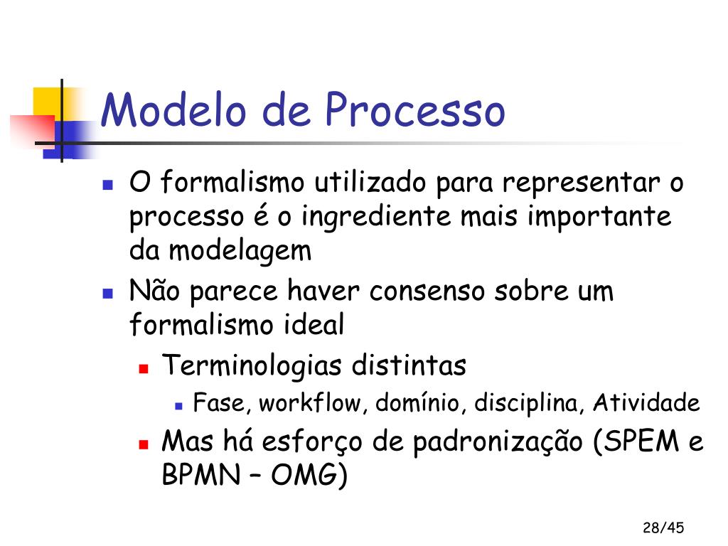 Modelo de Processo • O formalismo utilizado para representar o processo é o ingrediente mais importante da modelagem • Não parece haver consenso sobre um formalismo ideal • Terminologias distintas • Fase, workflow, domínio, disciplina, Atividade • Mas há esforço de padronização (SPEM e BPMN – OMG)