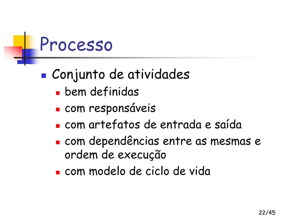 Processo • é uma ação regular e contínua (ou sucessão de ações) realizada de forma bem definida, levando a um resultado • é um conjunto parcialmente ordenado de atividades (ou passos) para se atingir um objetivo • define quem está fazendo o que, quando e como para atingir um certo objetivo