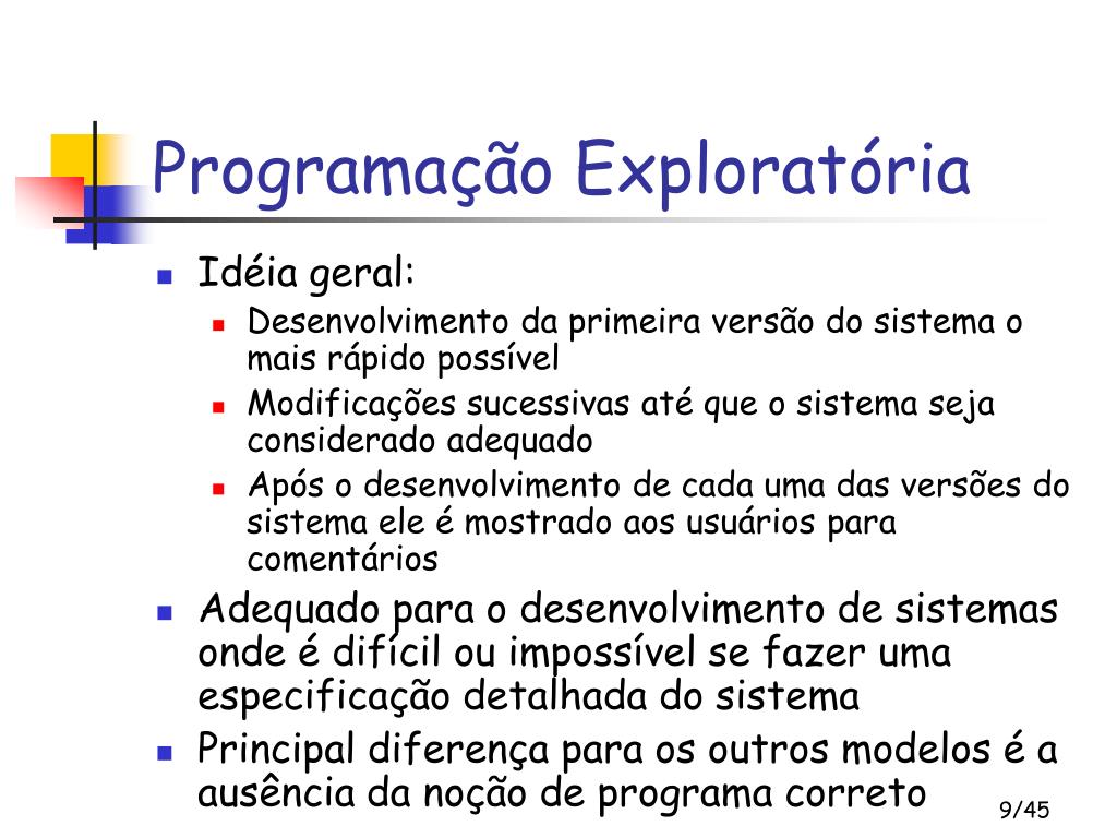 Programação Exploratória • Idéia geral: • Desenvolvimento da primeira versão do sistema o mais rápido possível • Modificações sucessivas até que o sistema seja considerado adequado • Após o desenvolvimento de cada uma das versões do sistema ele é mostrado aos usuários para comentários • Adequado para o desenvolvimento de sistemas onde é difícil ou impossível se fazer uma especificação detalhada do sistema • Principal diferença para os outros modelos é a ausência da noção de programa correto