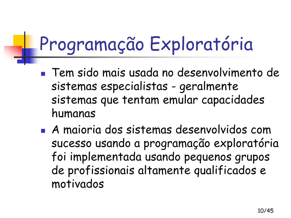 Programação Exploratória • Tem sido mais usada no desenvolvimento de sistemas especialistas - geralmente sistemas que tentam emular capacidades humanas • A maioria dos sistemas desenvolvidos com sucesso usando a programação exploratória foi implementada usando pequenos grupos de profissionais altamente qualificados e motivados